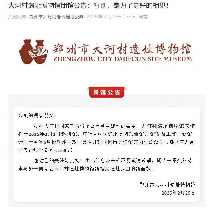 2月25日,郑州市大河村遗址博物馆发布闭馆公告。